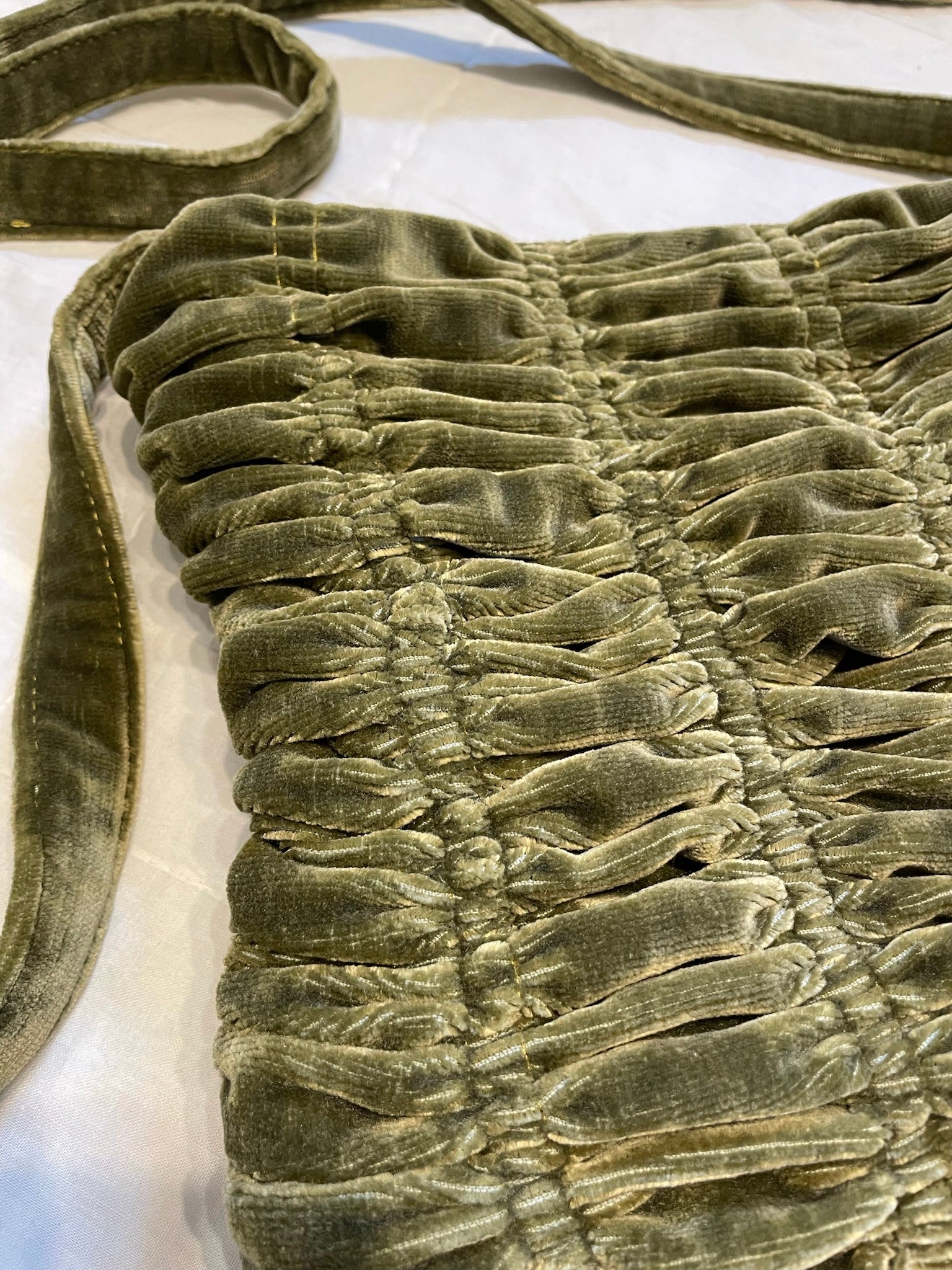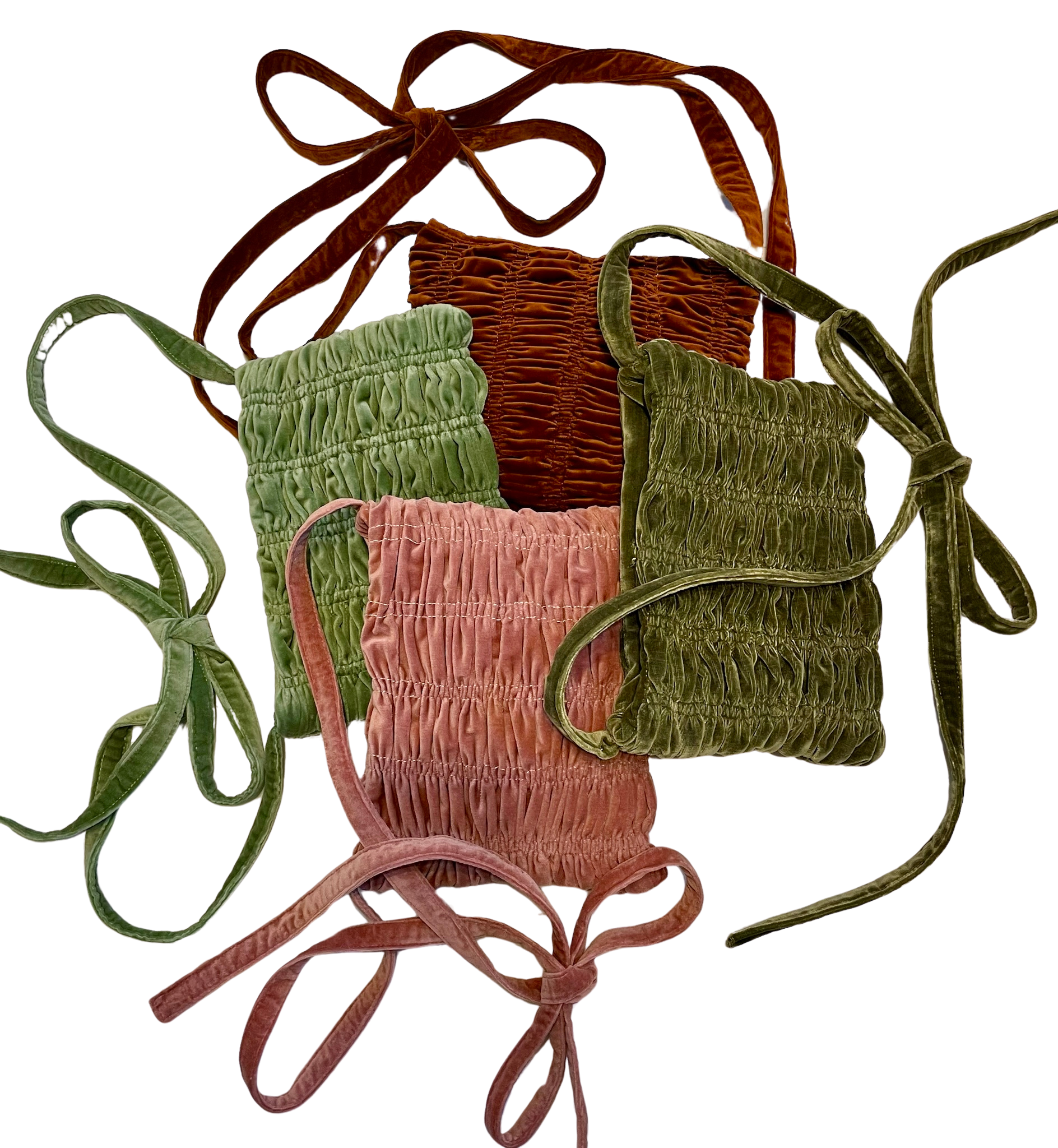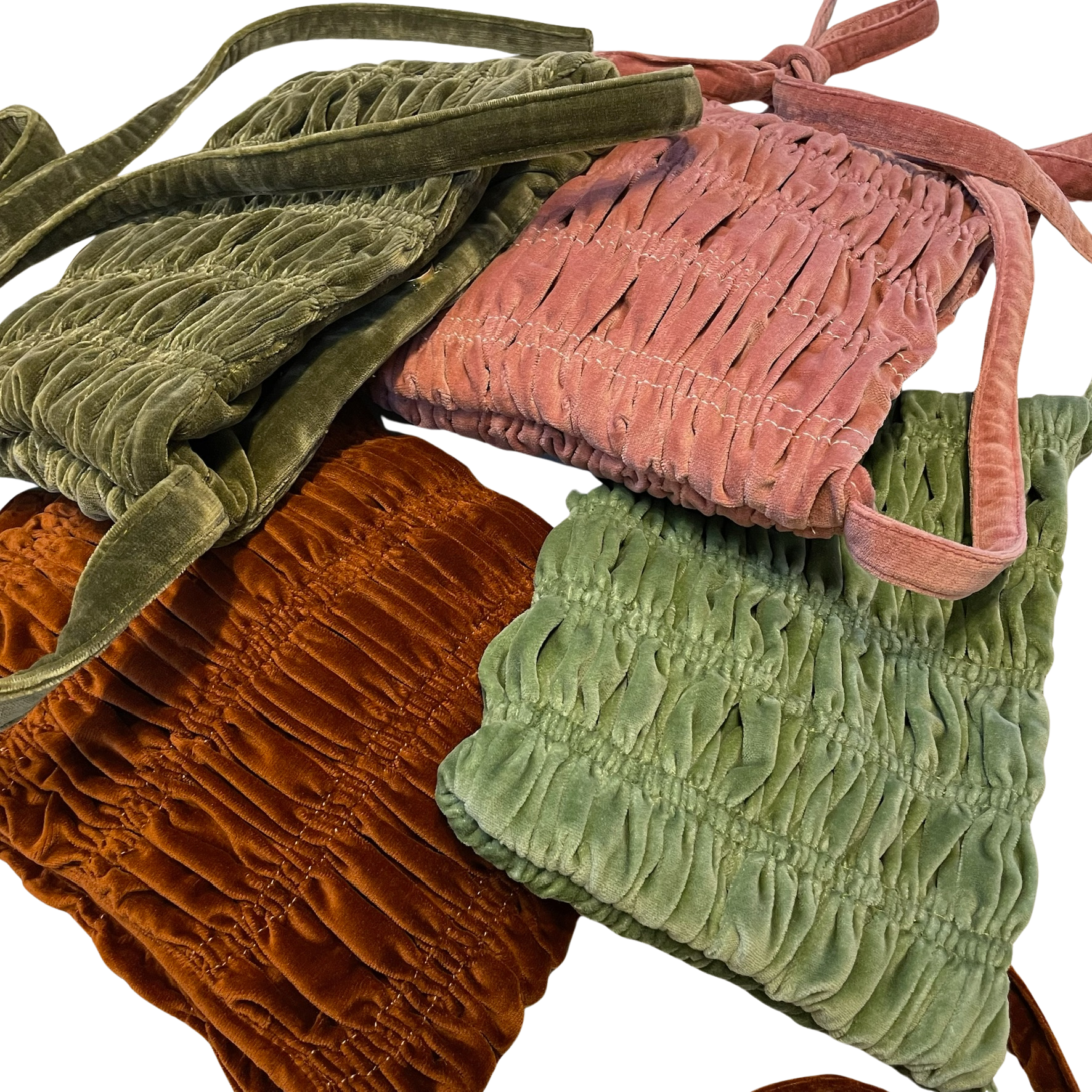 The PEAT shirred velvet crossbody is crafted from an opulent antique velvet, it's standout feature is the textured hand-shirred surface, adding interest to it's simple yet stylish design.