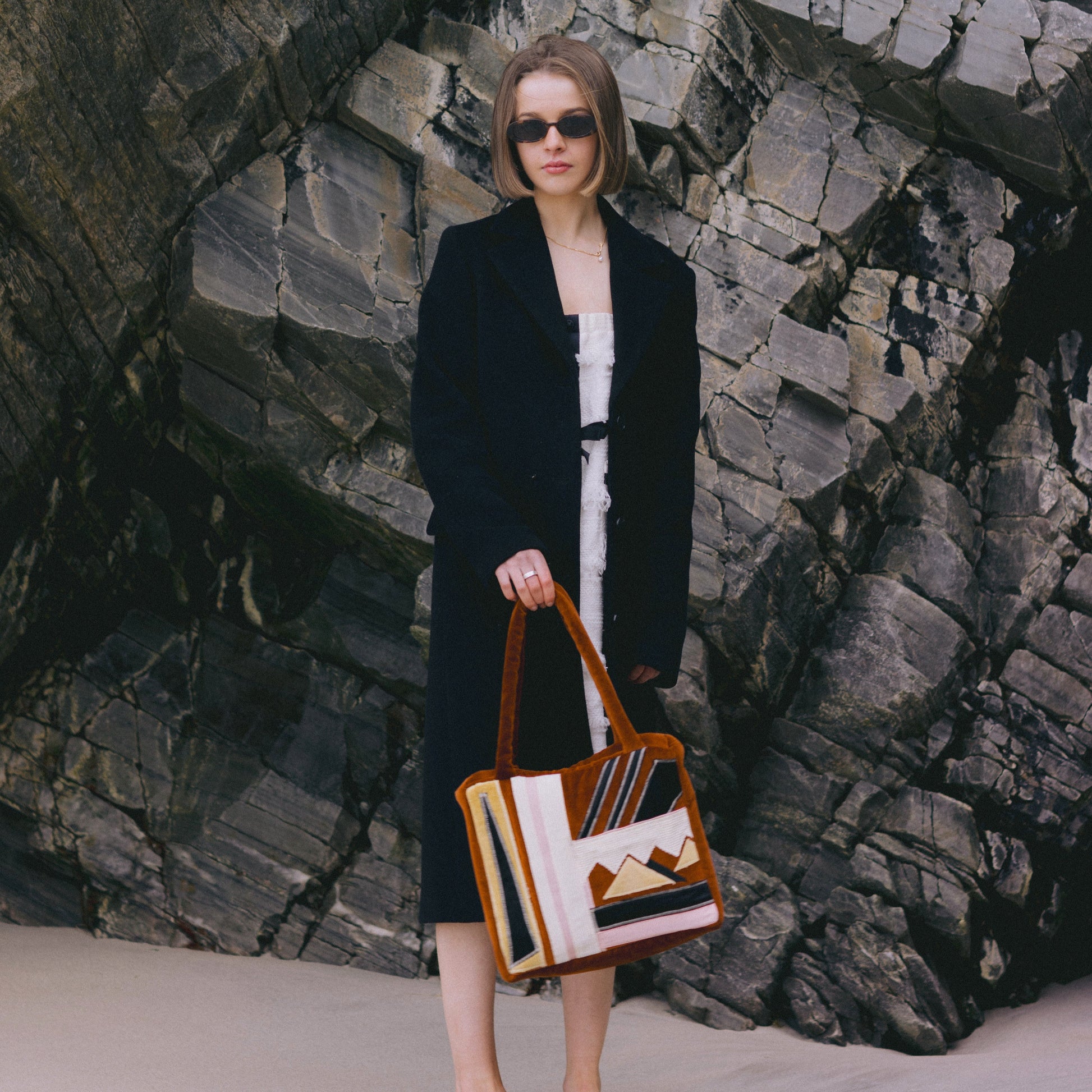The BOREEN Box Bag derives its name from the Irish term for "little road" or "cow path". Its appliquéd stripes and graphic panels mirror the organic shapes found along the meandering laneways and rural paths in our surrounding environment.