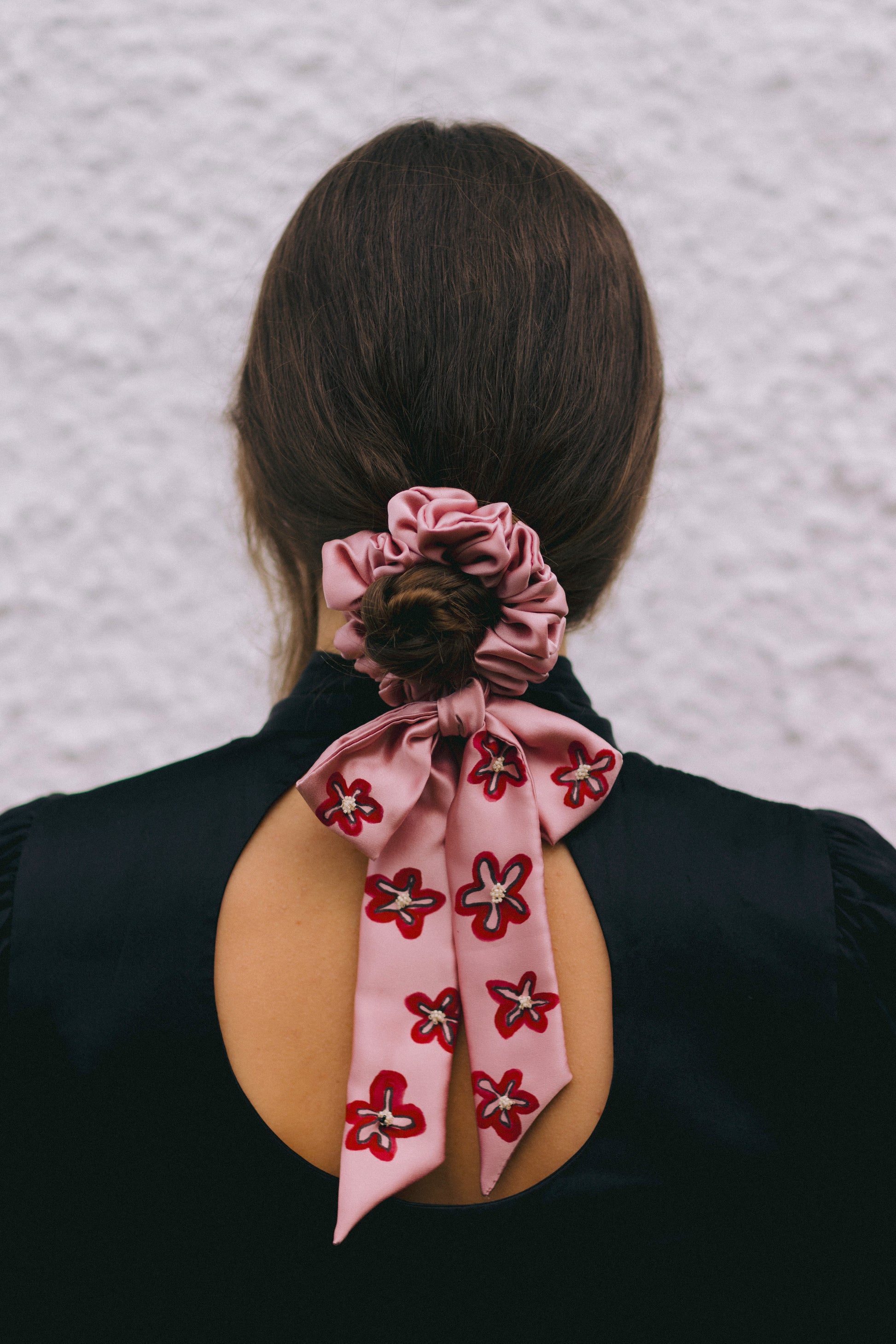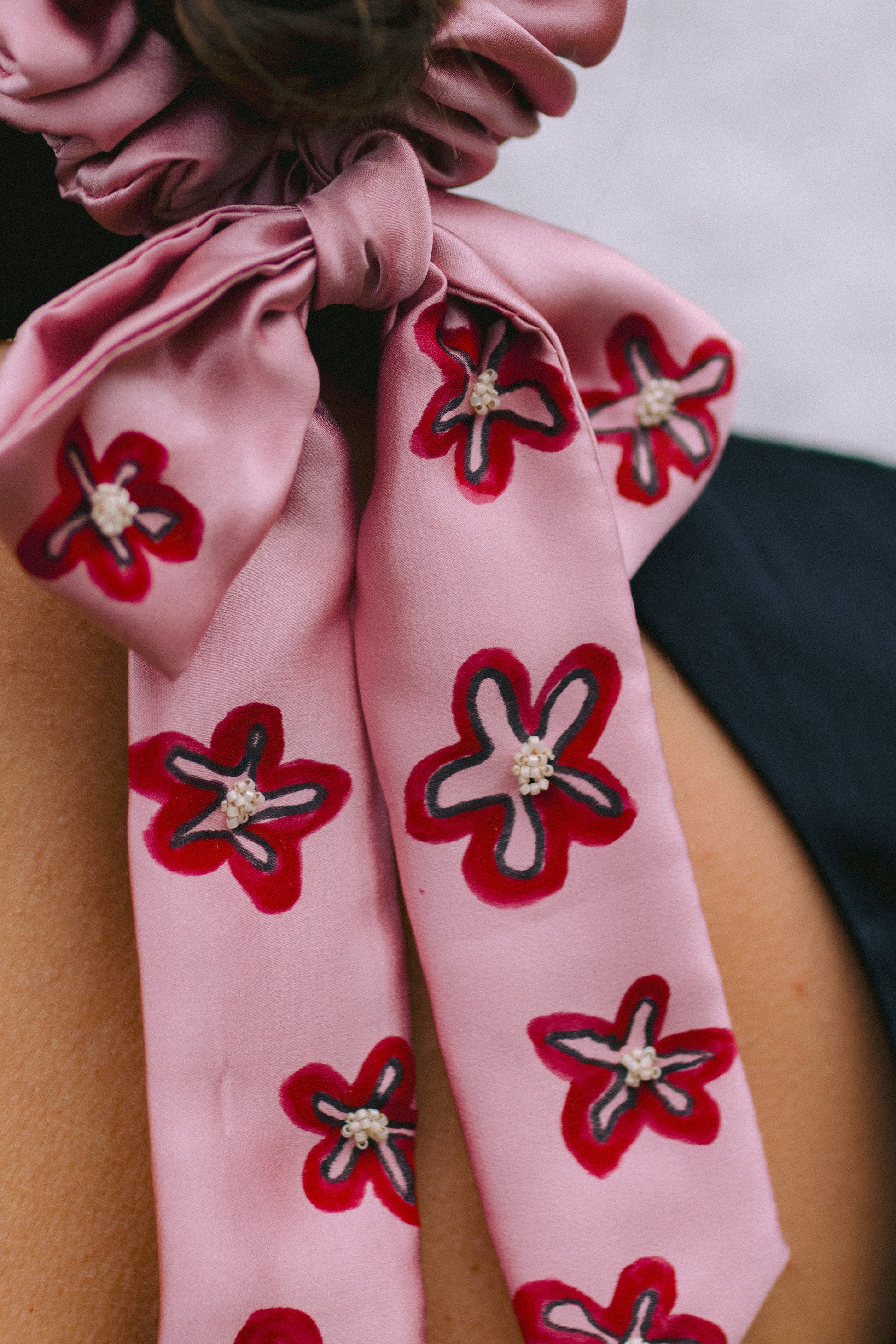 The CANNA bow band is constructed from silk off-cuts and remnants, and features a playful hand-painted floral pattern with patches of hand-beading.