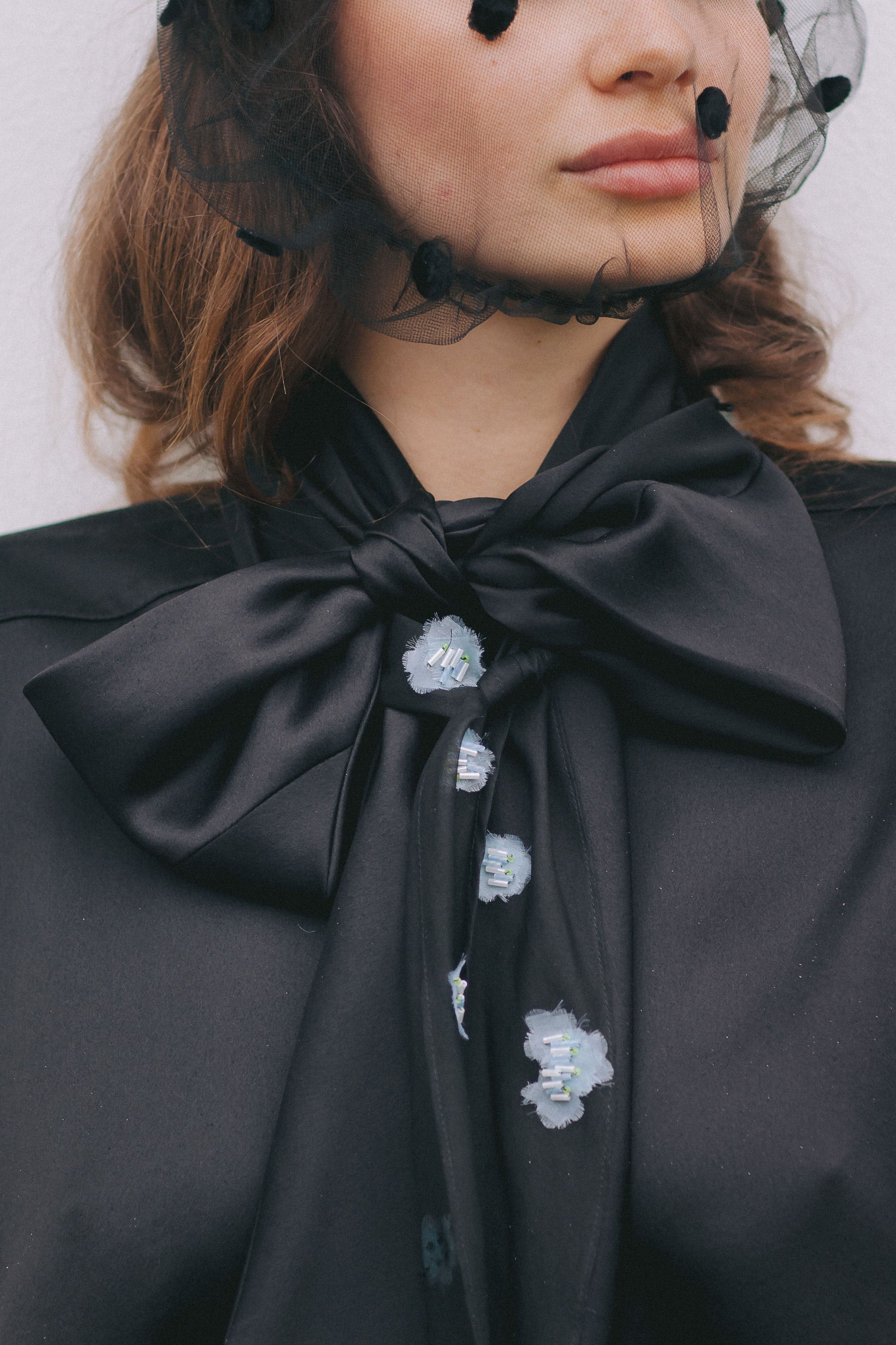 MEASUREMENTS: One size fits all. This piece has been designed with inclusivity in mind. There are no shoulder seams and the necktie can be tied to suit and fit most sizes.