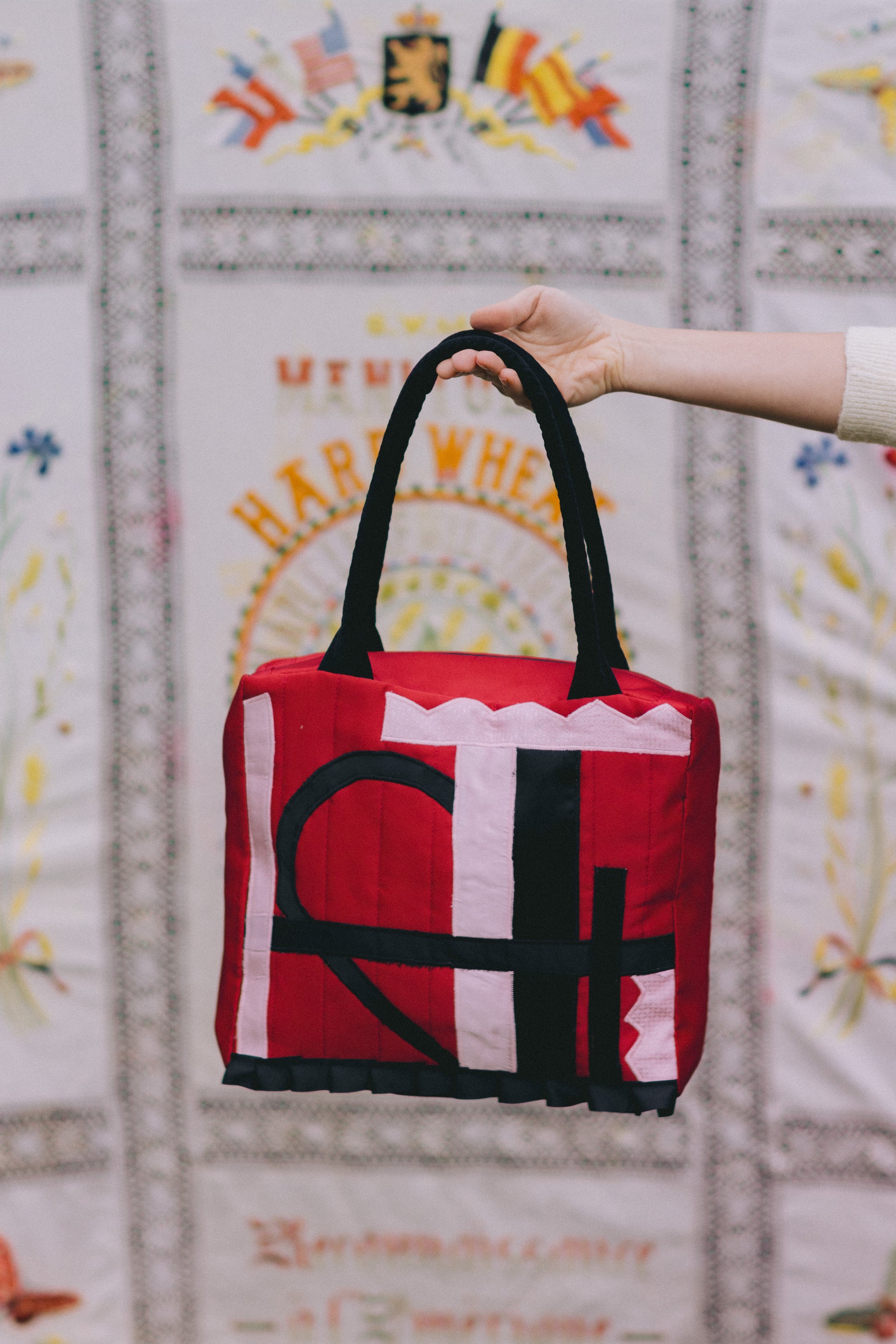 This medium sized box bag features our signature quilting and appliqué on a rich red satin base. We utilised off-cuts and remnants of rich pink silks and heavy black silk crepes for the abstract surface design. The base is finished with a playful ruffled ribbon stripe.