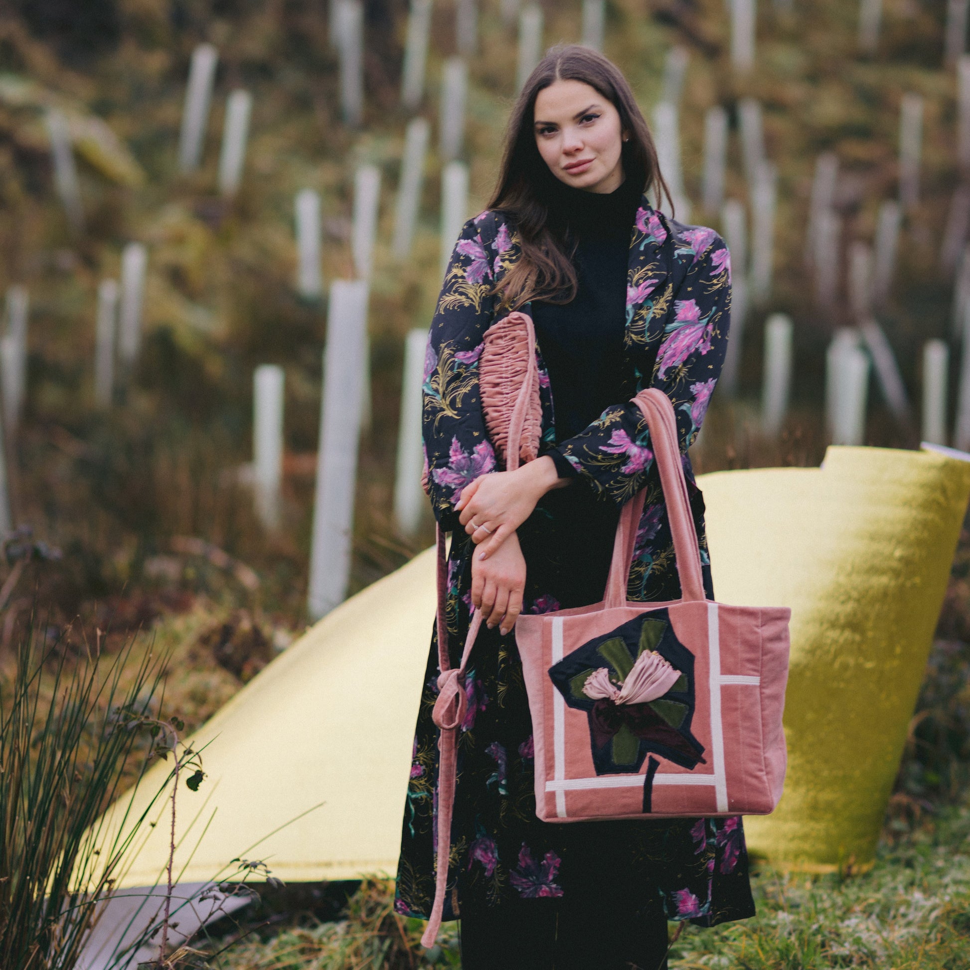 The tactile and graphic LARGO book bag is constructed from a heavy-weight antique velvet and features a rich floral appliqué design topped with layered double-weight silk and intricate beadwork.